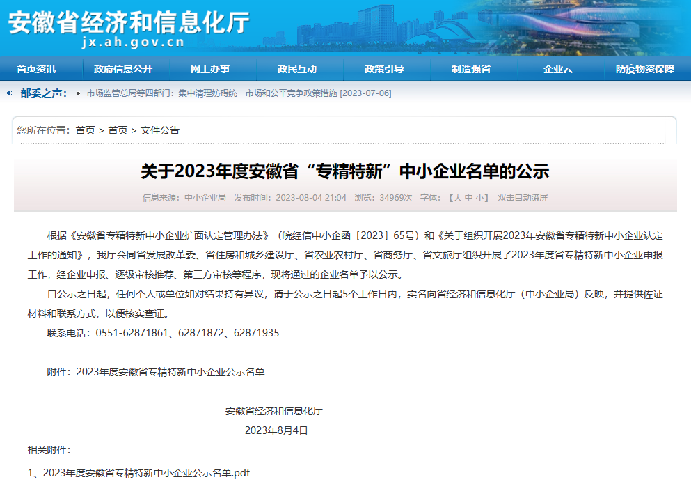 關(guān)于2023年度安徽省“專精特新”中小企業(yè)的名單,